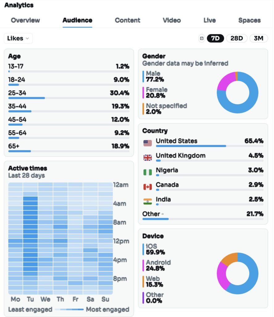 The activity heatmap shows the audience remains engaged throughout the week, with peak activity times concentrated in evening hours. The infrastructure for engagement exists; the algorithm simply appears to prevent it.