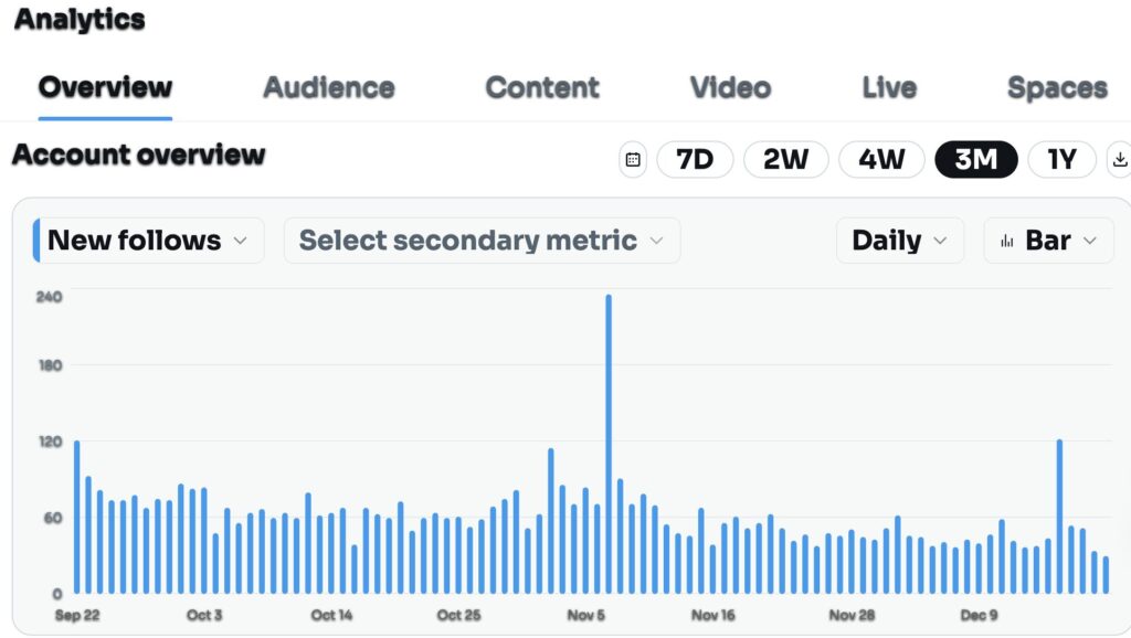 Only one metric showed growth: bookmarks surged 147% to 3,700, suggesting that users who do see the content find it valuable enough to save. But bookmarks don’t drive viral reach the way shares and reposts once did.